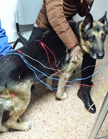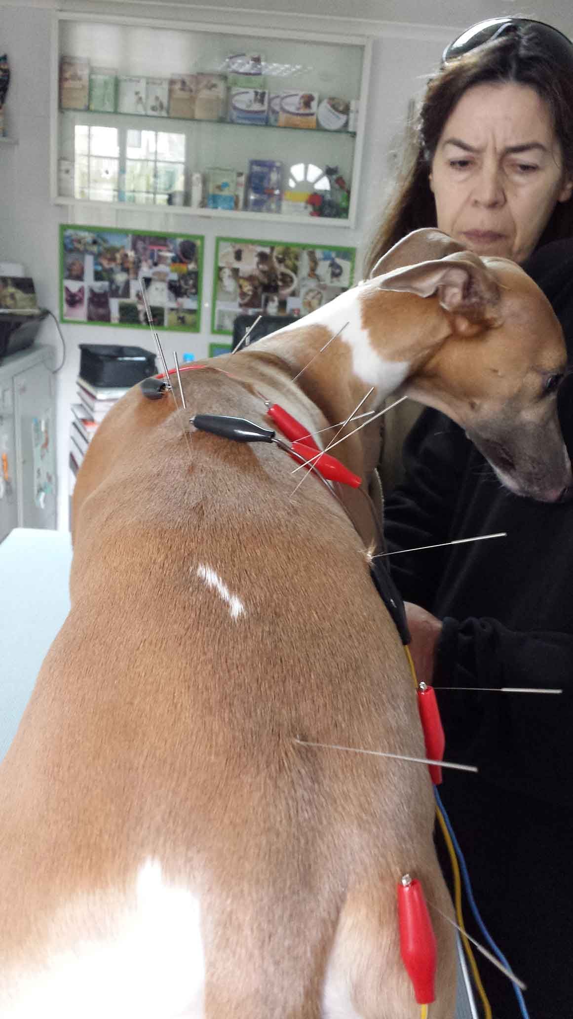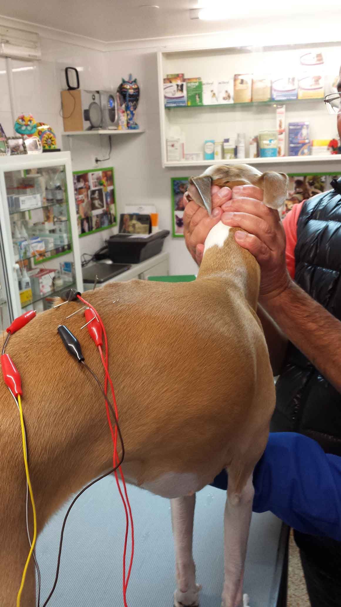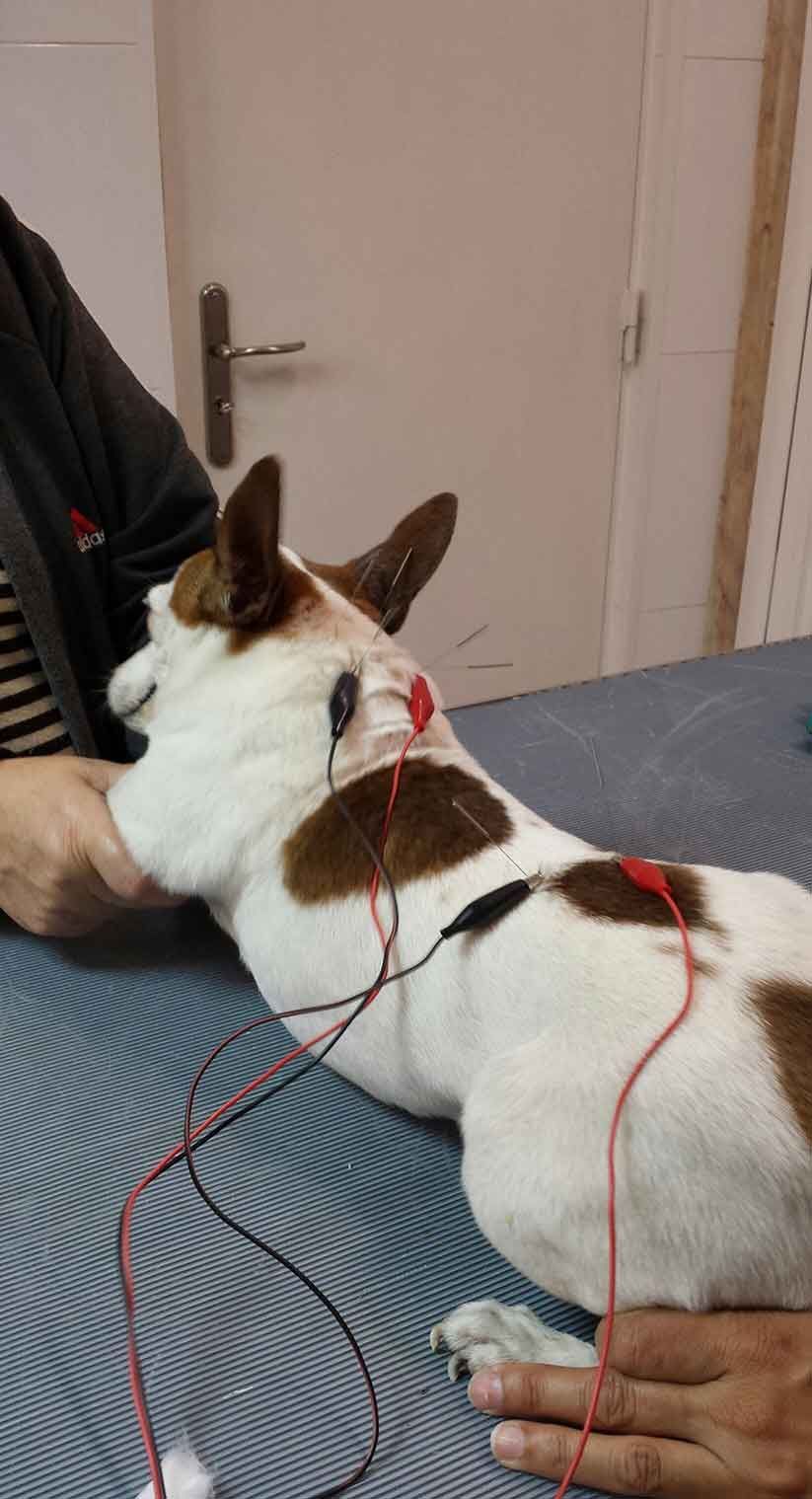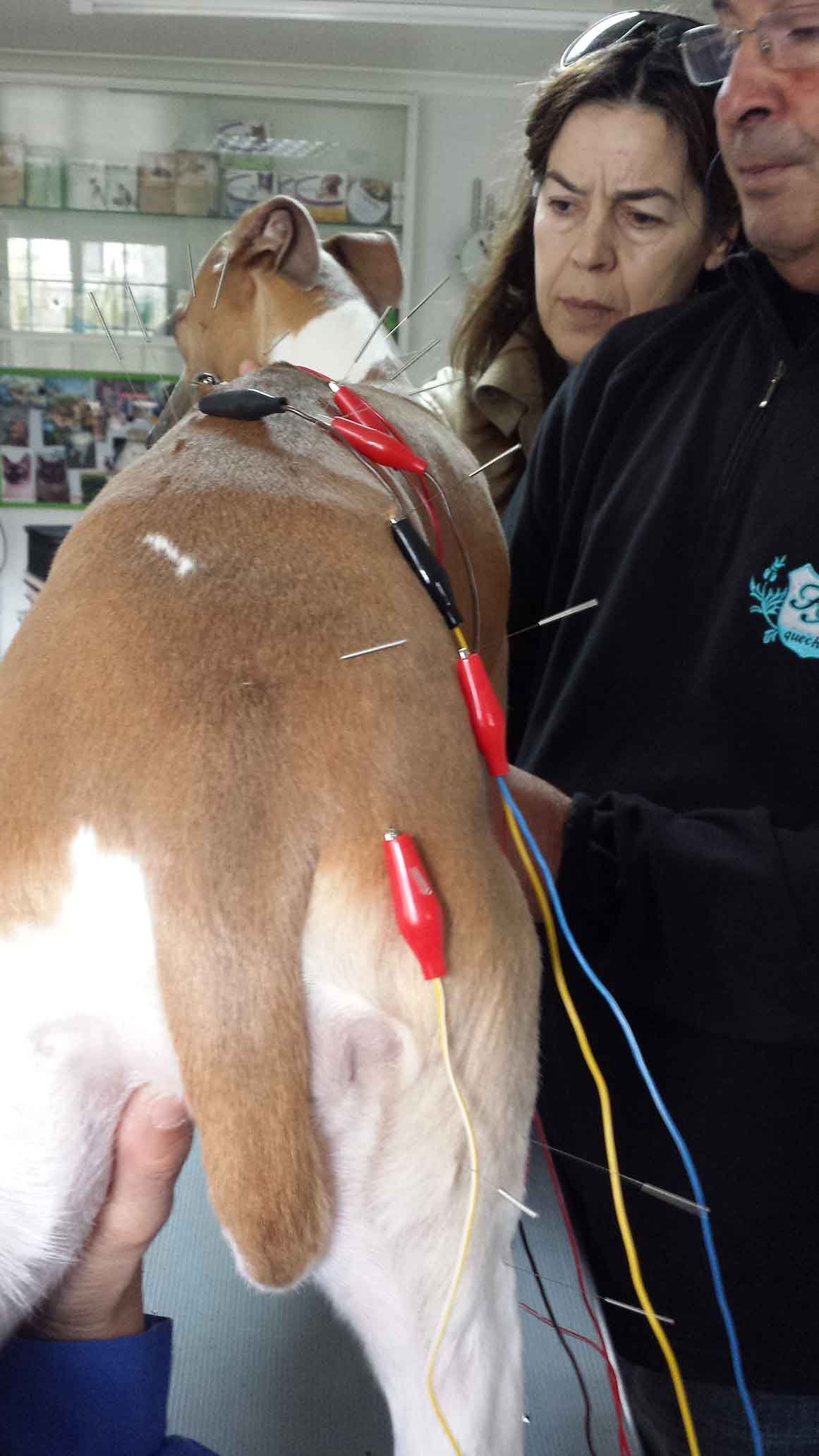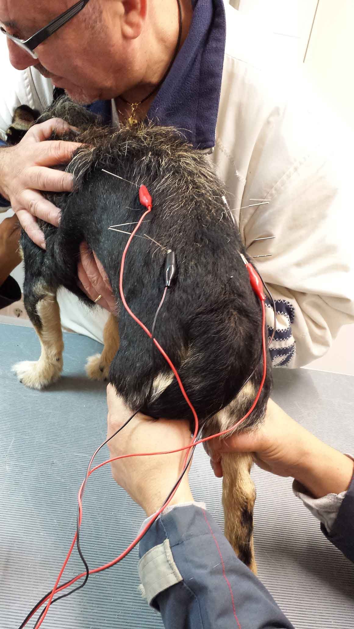 No corpo animal existem cerca de 360 pontos de acupuntura e o que fazemos no Centro Veterinário Dra. Rute Matos é colocar agulhas e elétrodos nesses pontos. É um tratamento bastante confortável para o cão e a força da corrente elétrica pode ser ajustada.